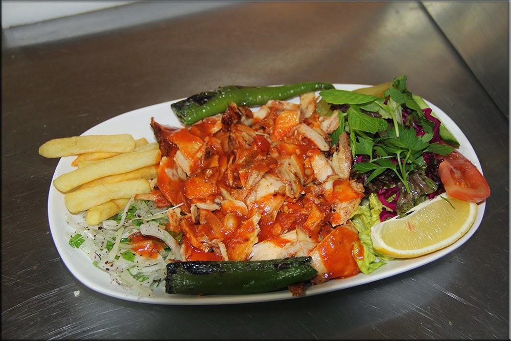130G TAVUK DÖNER, DOMATES SOS, YOĞURT, PİDE, KÖZLENMİŞ BİBER, TEREYAĞI İLE SERVİS EDİLİR.